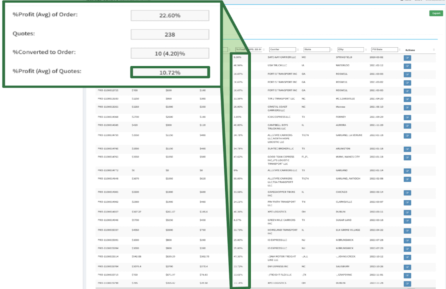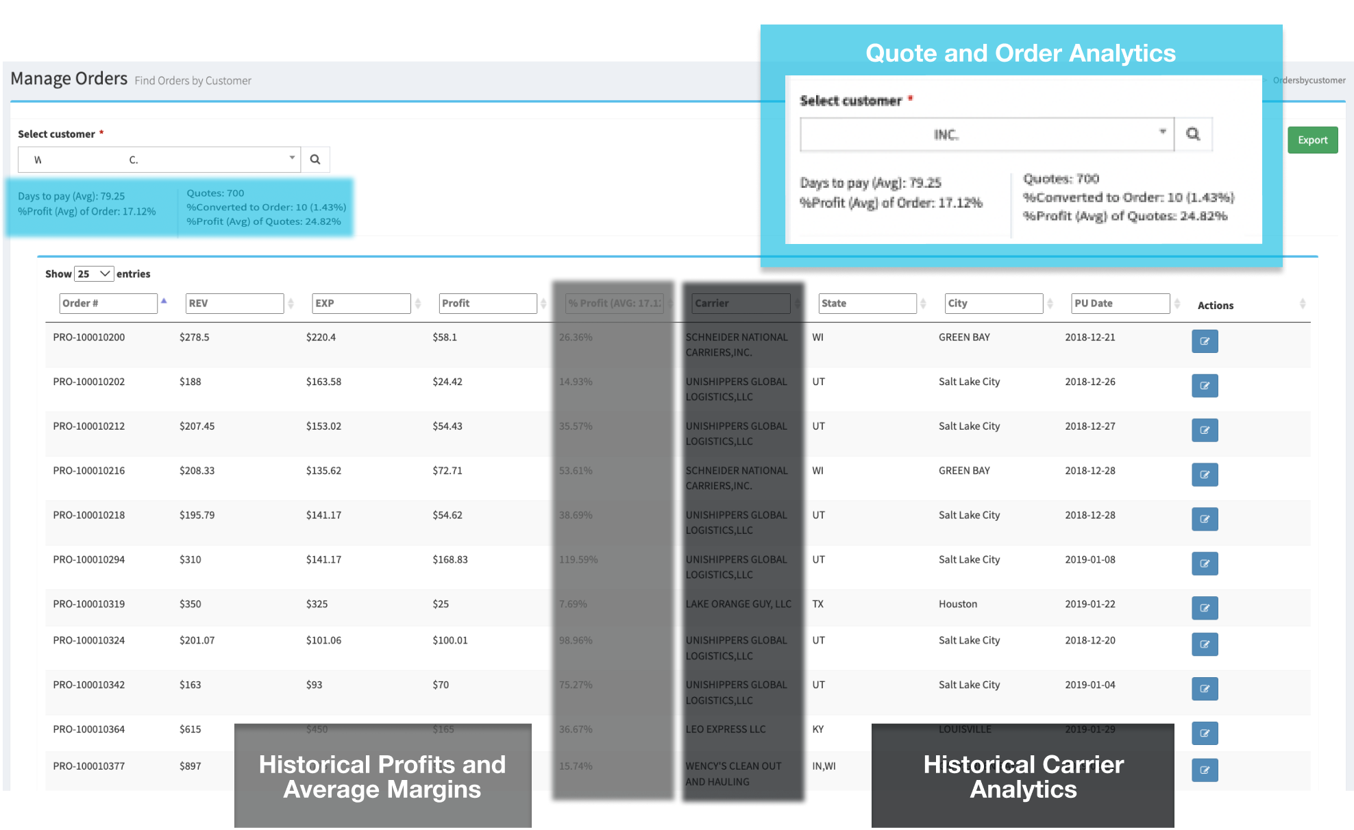 Compare your costs to the overall transportation market, with deep insights on current market costs and developing trends. Utilize our Quote Analytics to determine on-going customer statistics and price behavior.